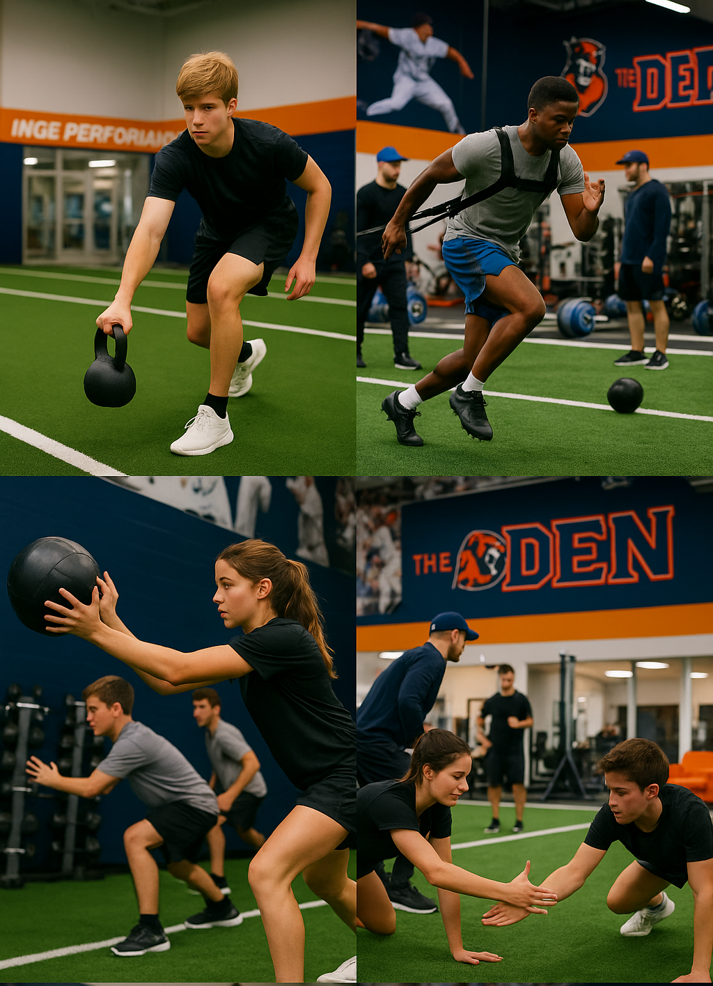 All training takes place in a dedicated performance space equipped with sled turf, free weights, resistance tools, and sport-specific stations—paired with measurable performance tracking to ensure athletes train with intent, efficiency, and visible results.